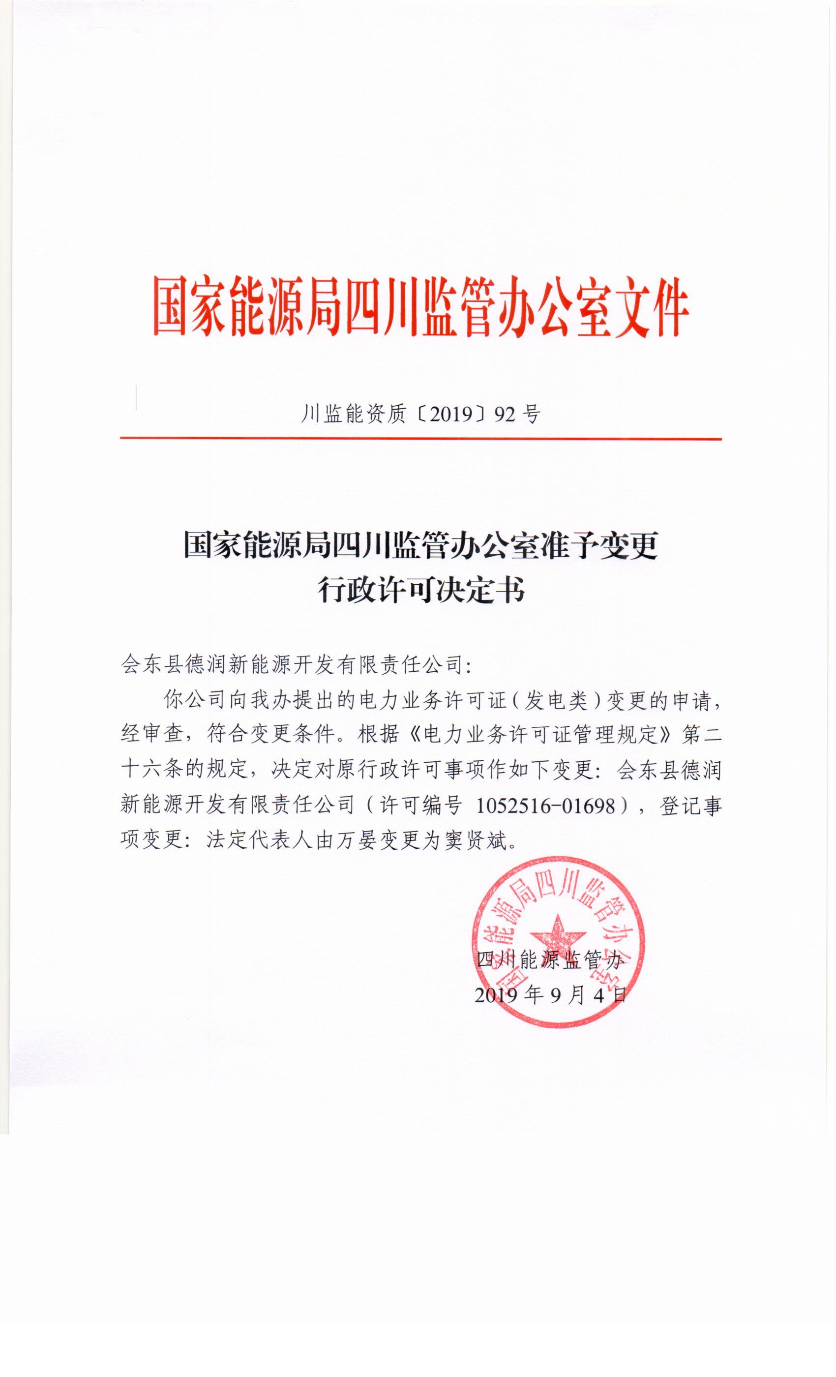 国家能源局四川监管办公室准予变更行政许可决定书(会东县德润新能源开发有限责任公司)